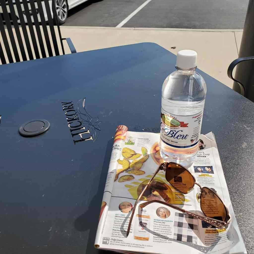 I finished my real estate appointment early and arrived at The Square a bit before 2 PM. I was able to find a great table where the wonderful warm sun was peaking under the sails. I had my sunglasses, a magazine, and a bottle of water, and put my phone away. Quiet time in the afternoon is rare, and I was taking full advantage. I was just about finished with my mag when Brittany arrived, she too had just finished an appointment and brought her shrimp spinach salad to enjoy in the sunshine. We visited for a bit before Tiffany arrived, because her appointment ran long. Once she got there it was time for a bottle of white from the Hickory Wine Shoppe (on the square, they give wrist bands and serve at the table).