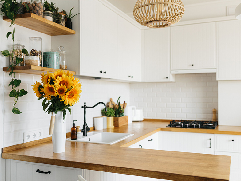 Start by filling a decorative glass bowl halfway with water. Cut the sunflower stems close to the head, and place them into the bowl, they should float. Floating-flower bowls look elegant on your kitchen table or entry table.